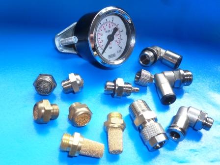 Wir bieten Ihnen zahlreiches Pneumatikzubehör in verschiedenen Ausführungen wie Verschraubungen, (Steck-)Anschlüsse, Schalldämpfer, Manometer und Druckregler.